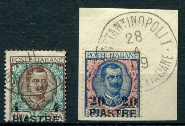 Italian Levant: 1908 Constantinople surcharged issue 4pi on L1 and 20pi on L5 with CONSTANTINOPOLI I * POSTE ITALIANE datestamp. Sassone 16-17