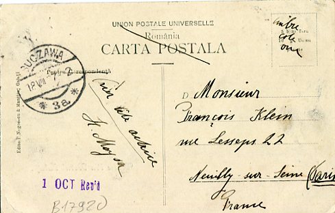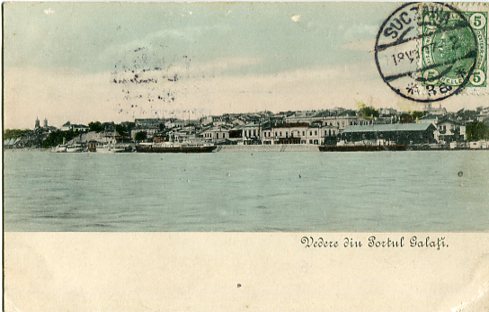 Austria – Romania: 1908 (18 August). Postcard titled ‘Galati. Vedere din Portul’ (ed. Negoescu & Manitiu) to France franked with 5h Austrian stamp and tied by SUCZAWA (Suceava) datestamp.