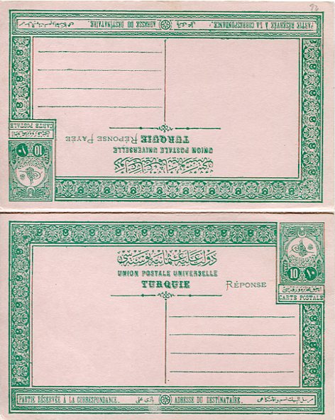 Ottoman Empire: 1908 unused 10pa Sultan Hamid Tughra postal stationery card with reply. Isfila AN93B