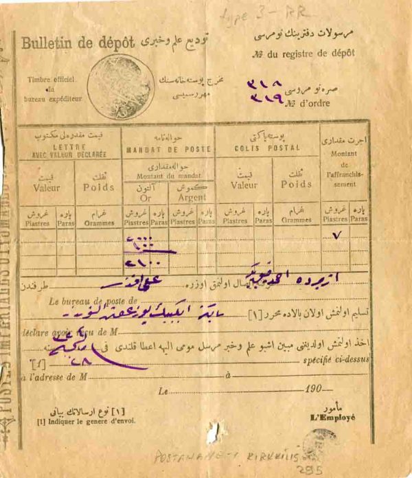 Ottoman Turkey: 1908 money order tied by POSTAHANE-I KIRKKILISE 295 (A&P type 3, RR) negative seal.