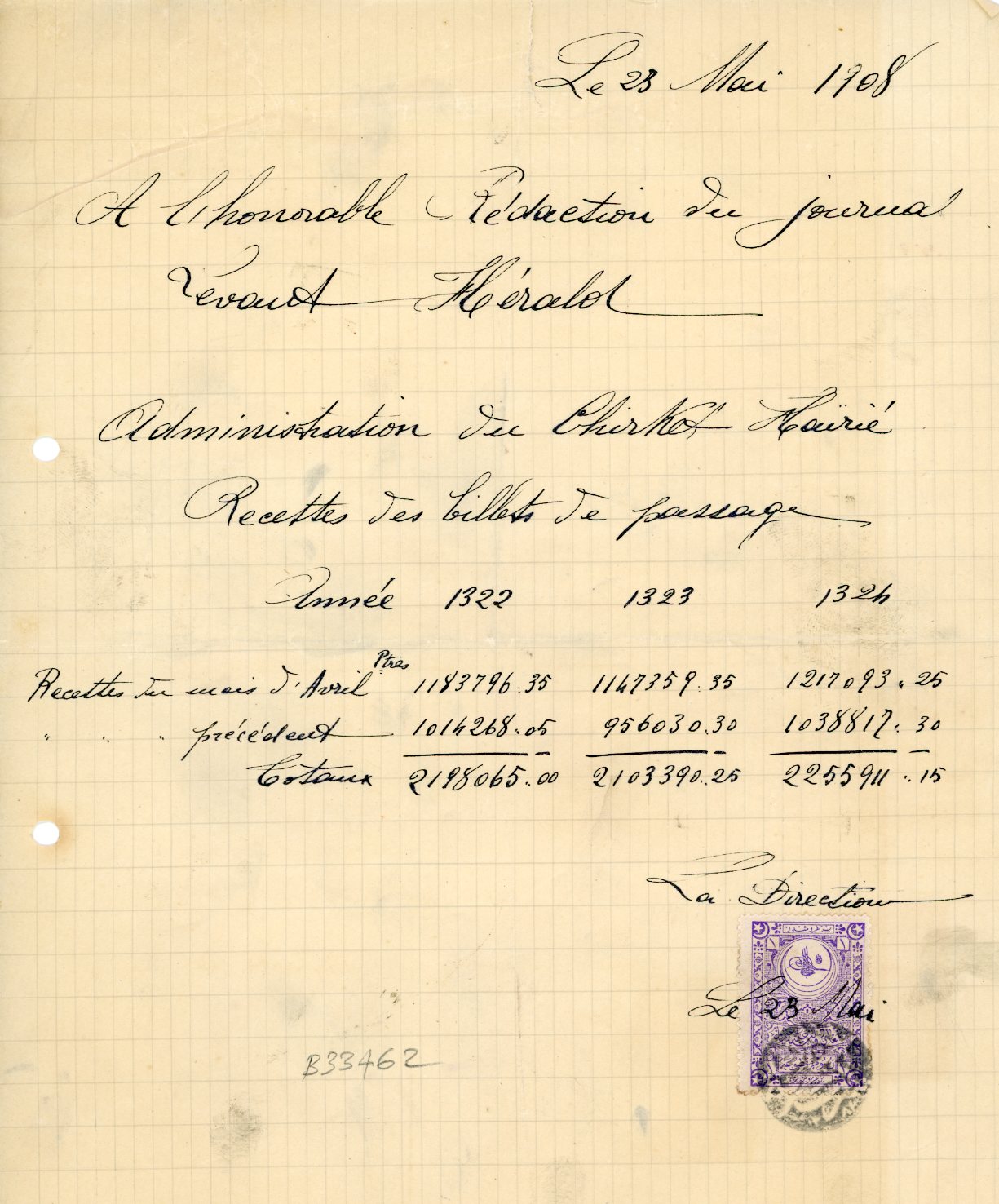 Türkiye: 1908 Levant Herald Journal document with fiscal stamp.