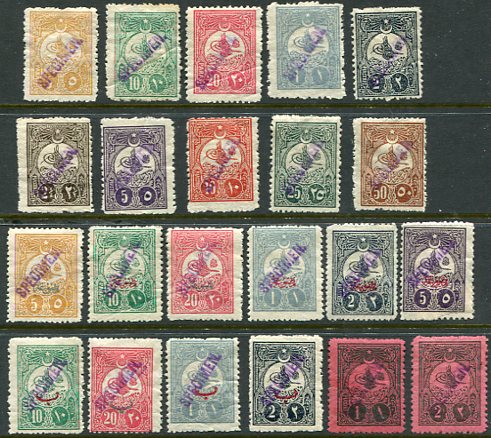 Ottoman Empire: 1908 (14 March). Sultan Adbulhamid II Tughra issue definitive set of 10, printed matter overprinted set of 6, “Behiye” (discount) overprinted for foreign mail overprinted set of 4 and postage due set of two handstamed SPECIMEN from the unidentified postal authority UPU archive. Unique