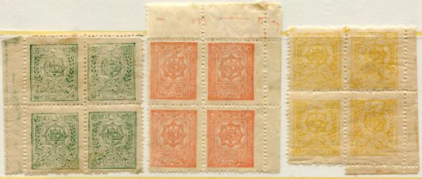 Afghanistan: 1909-19 coat of arms unmounted mint blocks of four 1a. carmine-rose, 2a. green and 2a. yellow. Sg. 168, 169, 170