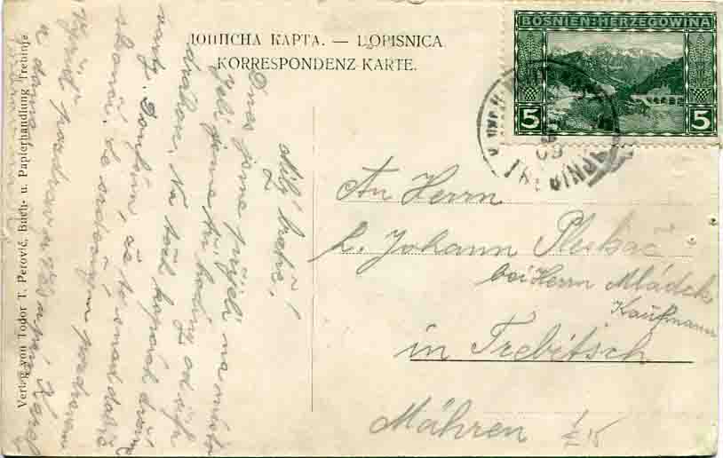 Bosnia and Herzegovina: 1909 picture postcard titled ‘TREBINJE Totalansicht’ (ed. Todor Petrovic) Mahren franked with 5h and tied by Austrian Military Post Trebinje date stamp.