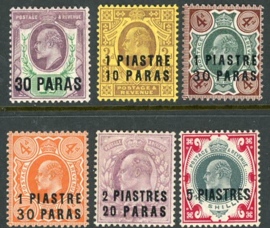 British Levant: 1909 (2 July). KEVII stamps surcharged in Turkish currency mint o.g. set. Sg. 16/21 *