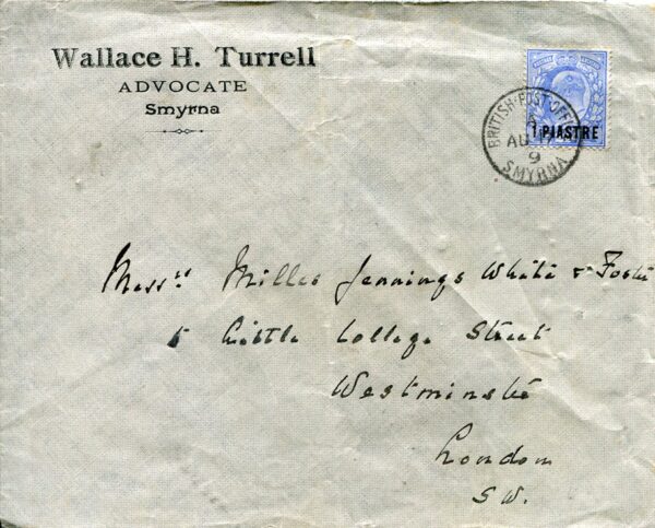 British Levant: 1909 (17 August). Wallace H. Turrell Advocate imprinted cover to London franked with 1pi surcharged on 2 1/2d KEVII Great Britain stamp tied by BPO Smyrna datestamp. Reverse 23 August arrival ds.