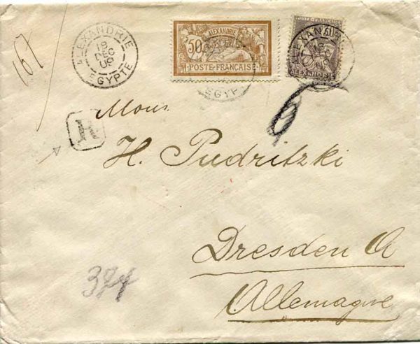 Egypt: 1909 (18 December). Registered cover to Dresden, Germany franked with French Post Office in Alexandria 30c and 50c tied by Alexandrie Egypte datestamps. Reverse illegible arrival cds. Sg. 30, 32