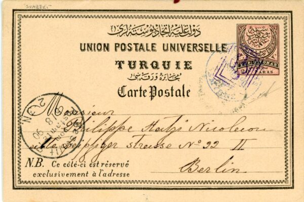Ottoman Post Offices in Greece: 1890 (July). 20pa. postal stationery card to Germany struck by triple box SÜMBEKI (vilayet Cezayir-i Bahri Sefid [Archipelgo], A&P type 2, GR #604, RR) hand stamp, Smyrne transit and 5 August Berlin arrival cds’s.