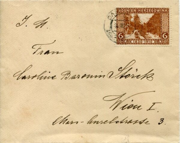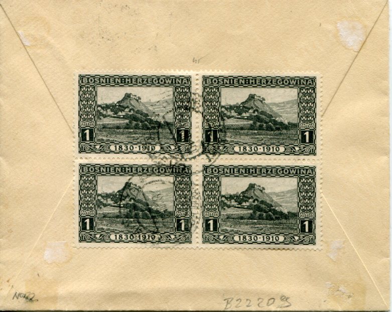Bosnia and Herzegovina: 1910 (28 July). Cover to Vienna franked with 6h and on reverse block of 4 1h perf. 12 1/2 Jubilee issue of 1910 tied by Sarajevo Military Post datestamps. Mi. 45, 49 – Sg. 186A, 190A