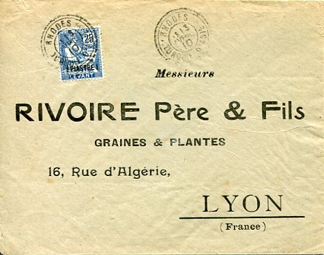 French Levant: 1910 (13 April). Cover to France franked with 1pi Turkish Currency surcharged 25c Levant stamp tied by RHODES * TURQUIE D’ASIE datestamps. Reverse 16 April Smyrne transit and 21 April Lyon arrival cds’s.