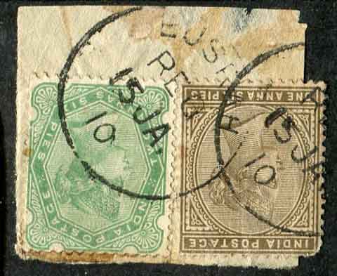 Iraq: 1910 (15 January). India Used Abroad 1a.6p. sepia and 2a.6p. yellow-green on piece cancelled by SG type Z7 BUSRAH REG. date stamps. Sg. Z138, Z147