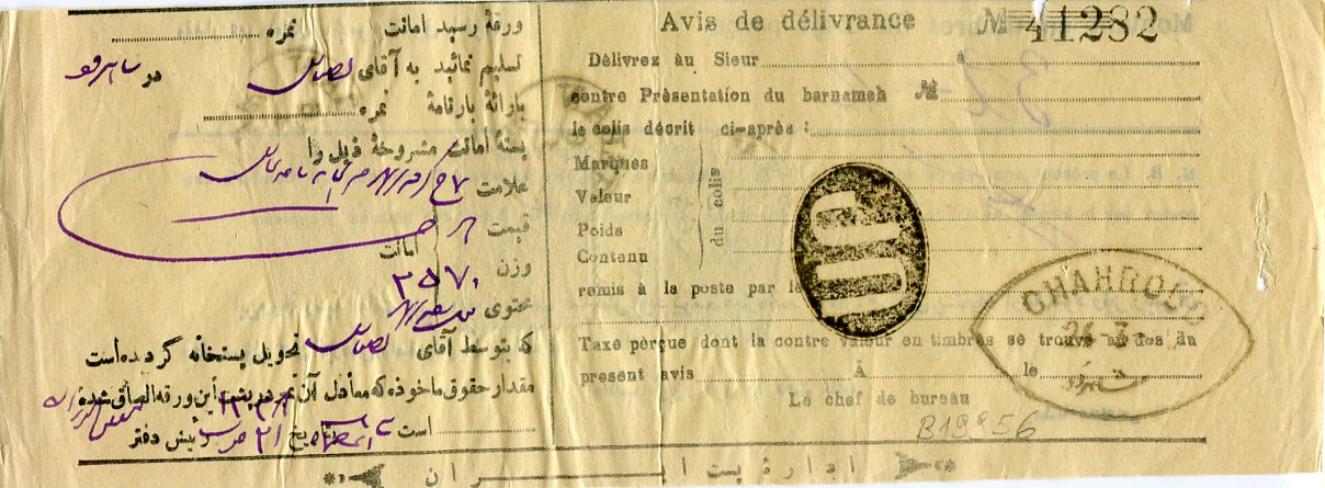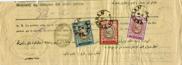 Iran: 1910 (16 March). Waybill franked with 10ch, 2kr and 30k coat of arms definitive stamps tied by Teheran datestamp and on reverse 24 March Chahroud oval ds.