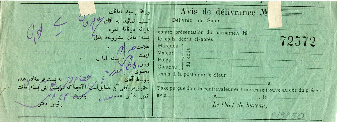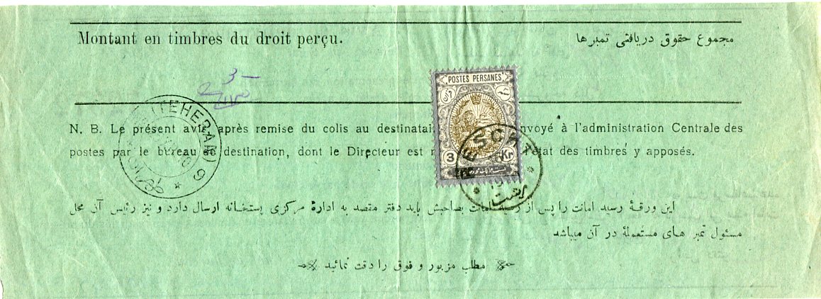 Iran: 1910 (16 December). Waybill franked with 3k coat of arms definitive stamp tied by Rescht datestamp and 25 December Teheran cds.