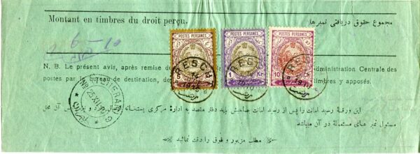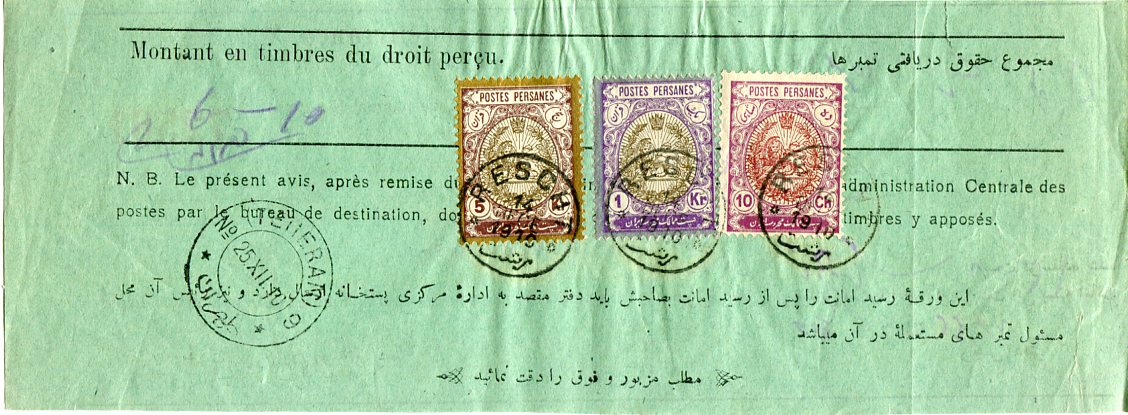 Iran: 1910 (14 December). Waybill franked with 10ch, 1kr and 5k coat of arms definitive stamps tied by Rescht datestamp and 25 December Teheran cds.