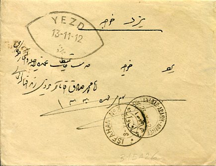 Iran: 1912 (16 October). Cover to Yazd franked on reverse with pair of 3ch perf. 11 1/2 x 11 Ahmed Mirza definitive stamps tied by Kazvin datestamp, 21 October Hamadan, 25 October Sultabanad – Aragh, 3 November Isfahan transit and 13 November oval Yezd arrival cds’s.