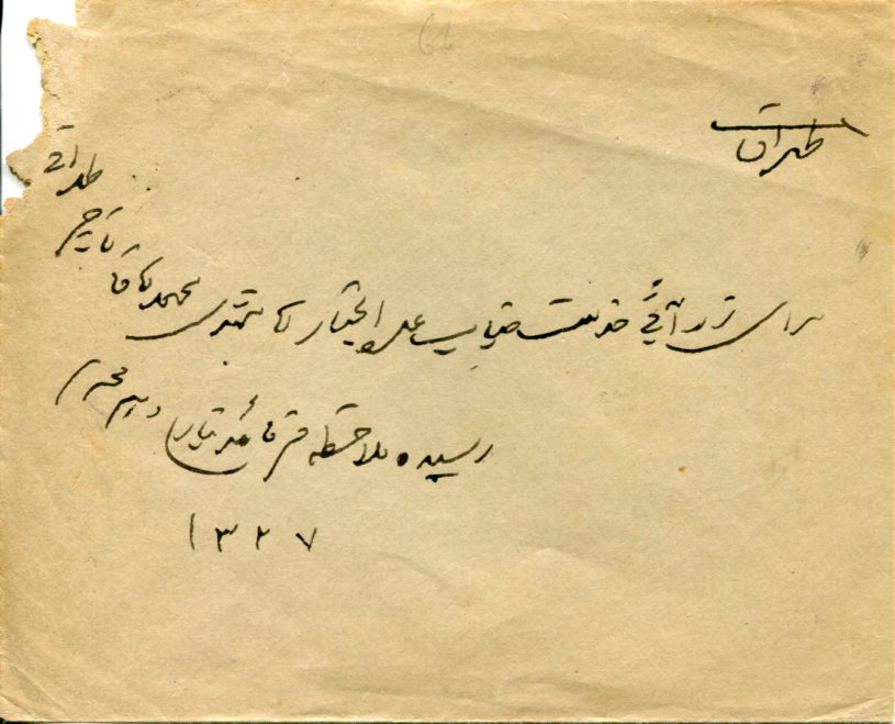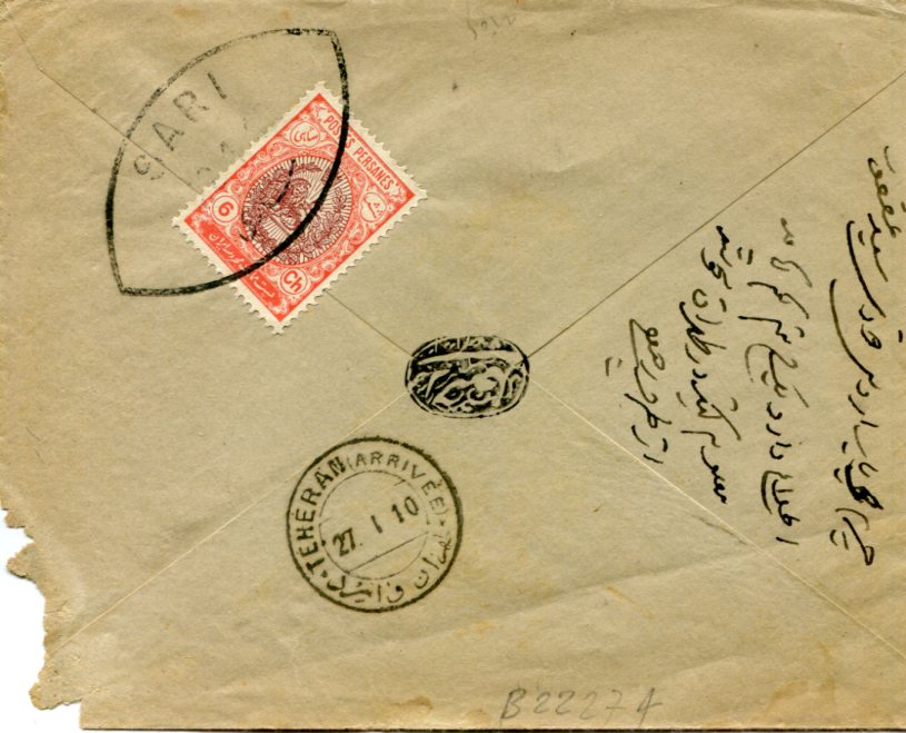 Iran: 1910 (January). Cover to Teheran franked with 6ch coat of arms stamp tied by SARI oval datestamp and 27 January Teheran arrival cds’s.