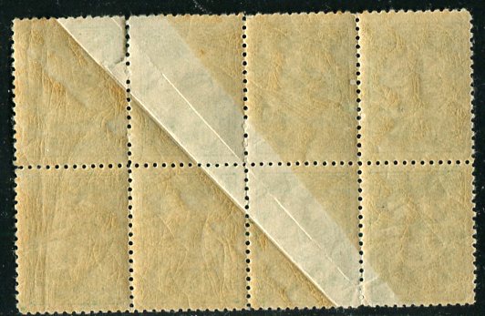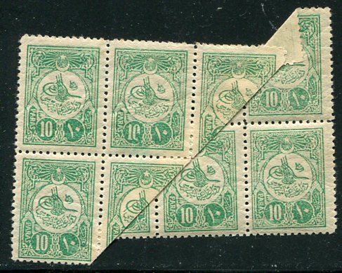Ottoman Empire: 1910 Sultan Reshad Tughra 10pa plate II perf. 12 unmounted mint block of eight with paperfold error error. Largest multiple recorded. Isfila 299KV24. **