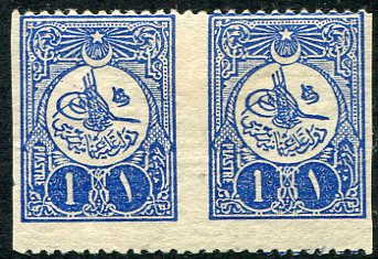 Türkiye: 1910 Sultan Reshad Tughra 1pi. ultramarine perf. 12 plate II imperforate between mint o.g. horizontal pair. Isfila 301DE17, Sg. 275Ab. *