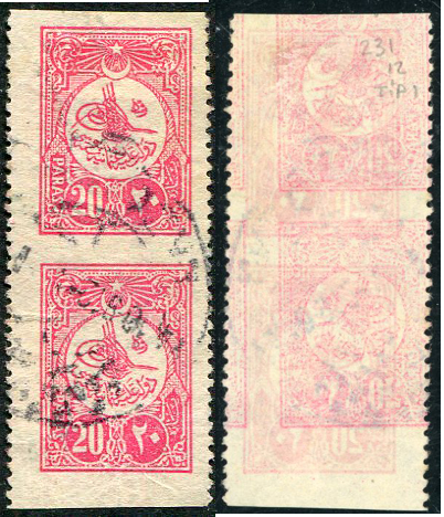 Türkiye: 1910 Sultan Reshad Tughra 20pa. perf. 12 plate II imperforate between, also on top & bottom vertical pair and offset variety struck by large part datestamp. Isfila 300DE17.