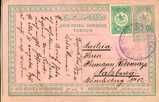 Ottoman Turkey: 1910 (10 November). 10pa of 1909 postal stationery card additionally franked with 10pa of 1909 issue to Salzburg, Austria tied by Buyukdere – Buyuk-Dere (vilayet Istanbul, A&P type 7, R) bilingual datestamp in blue. Isfila AN100