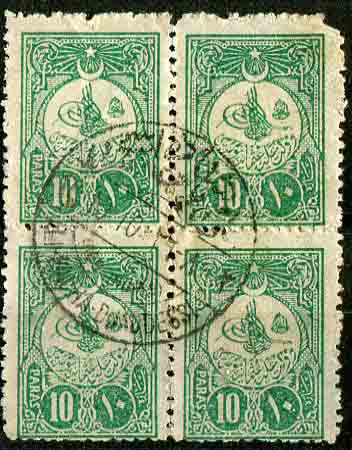 Ottoman Turkey: 1910 (18 October). Block of four 10pa of 1908 issue struck by ALI PASA CADDESI (EDIRNE) – ALI-PACHA-DJADDESI (ANDRINOPLE) (A&P type 1) datestamp.
