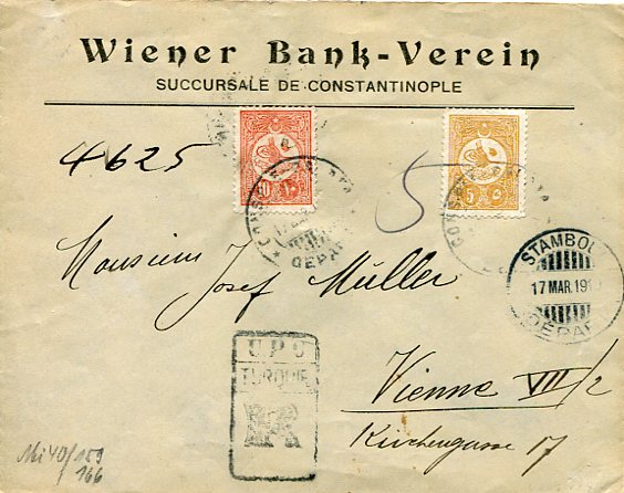 Ottoman Turkey: 1910 (17 March). Registered Wiener Bank cover to Austria overfranked with 5pa and 10pi of 1909 issue tied by Stamboul Depart datestamps and on reverse 21 March Vienna arrival cds.