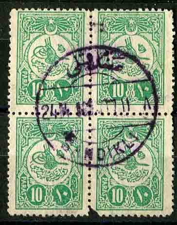 Ottoman Turkey: 1910 (24 April). Block of four 10pa of 1910 issue struck by superb violet SANDIKLI (A&P type 4, R) bi-lingual datestamp.