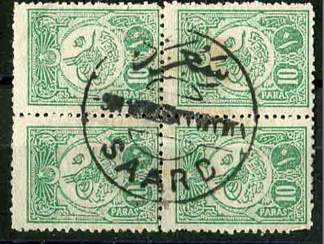 Ottoman Turkey: 1910 (25 May). Block of four 10pa of 1910 issue struck by superb SIIRD – SAARD (vilayet Bitlis, A&P type 4, R) bi-lingual datestamp.
