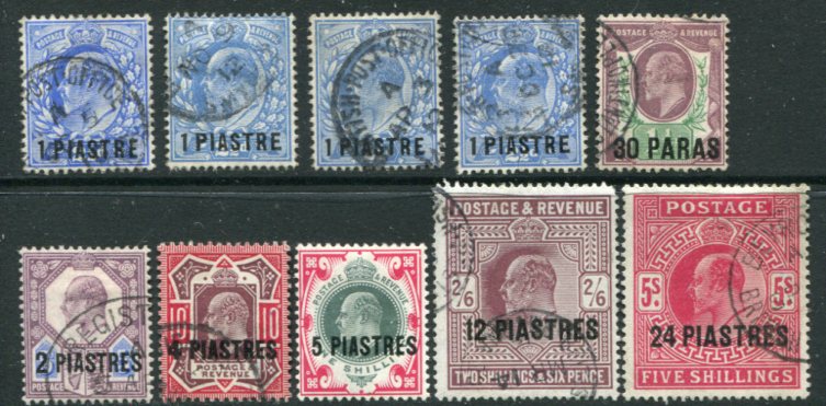 British Levant: 1911-13 various stamps of KEVII surcharged in Turkish Currency at Somerset House used set. Scarce assembly. Sg. 25/34