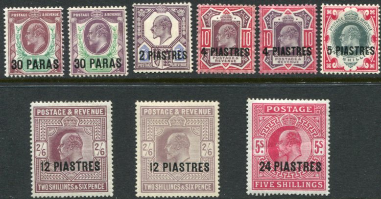 British Levant: 1911-13. Stamps of KEVII surcharged at Somerset House mint o.g. set of six additionally with 30pa on 1 ½d slate-purple and green, 4pi on 10d dull reddish purple and carmine and 12pi on 2s6d dull greyish purple colour varities Sg. 29/34, 29a, 31b, 32a. *
