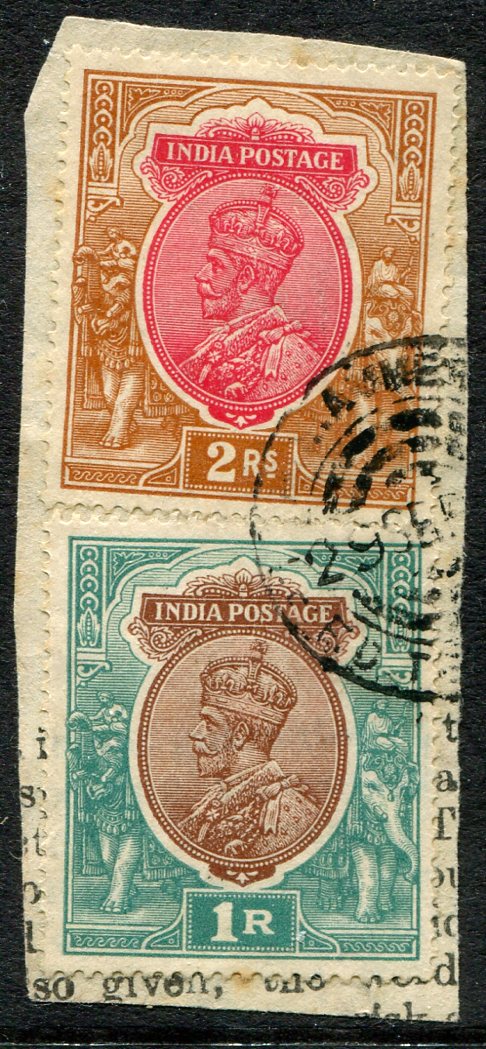 India Used Abroad – Iran: 1911 India KGV 1r and 2r on piece struck by Mohammerah Telegraph datestamp. Sg. Z474, Z475