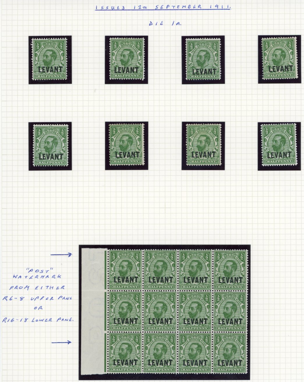 British Levant: 1911 (12 September). KGV 1/2d. green die A. wmk Crown overprinted LEVANT unmounted mint or mint o.g. collection of eight singles and a block of 12 on page. Sg. L12. ** / *