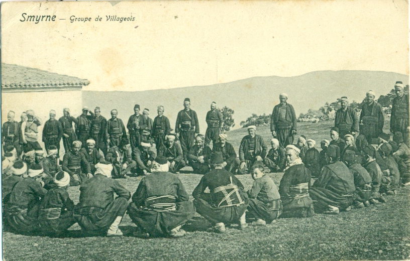 British Levant. 1911 (MAR 23) Ottoman picture postcard of group of villagers Smyrne [Izmir] to England franked on reverse 1d carmine Levant stamp and tied by B.P.O. SMYRNA date stamp.