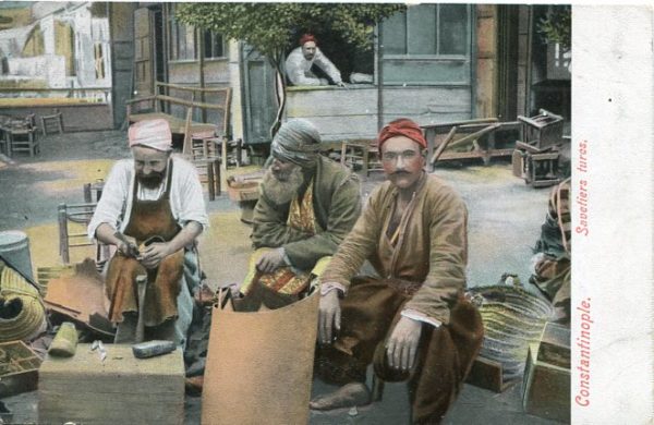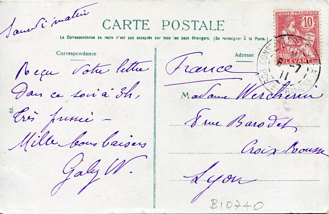 French Levant: 1911 (8 July). Postcard titled ‘Constantinople. Savetiers turcs’ to Lyon franked with 10c Levant stamp and tied by dispatch datestamp.