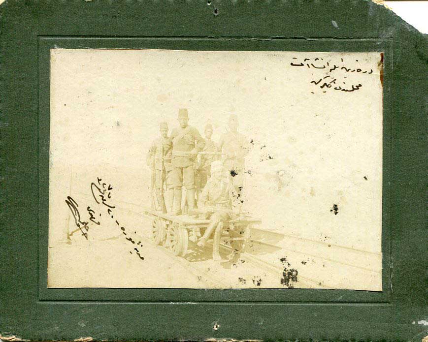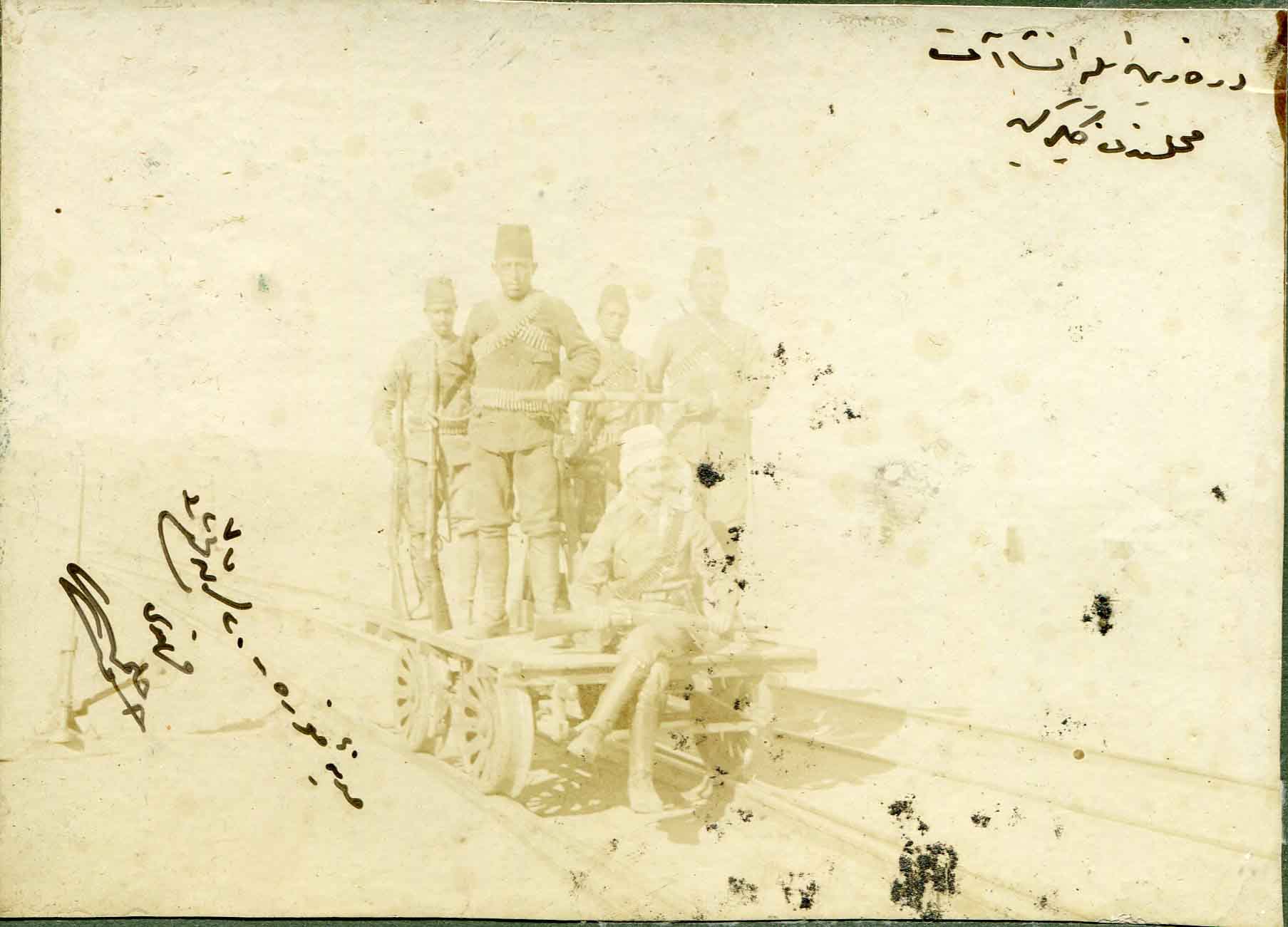 Saudi Arabia: 1911 dated real photograph of Medina Decauville Narrow Gauge Railway Line with soldiers. Very rare. Overall size 150 x 120mm.