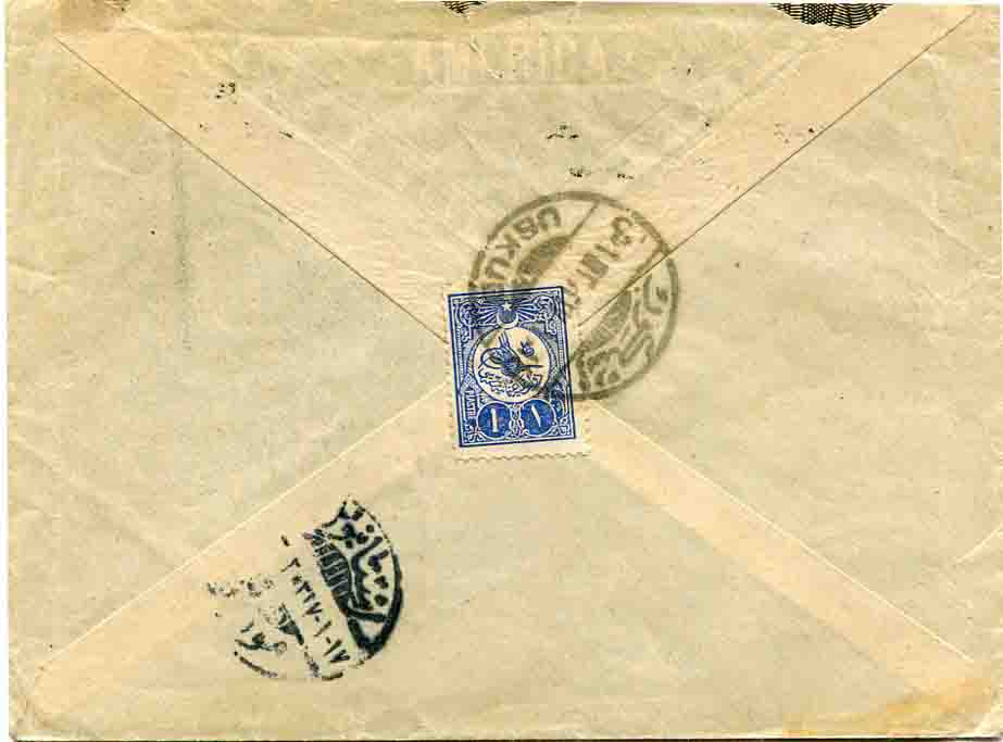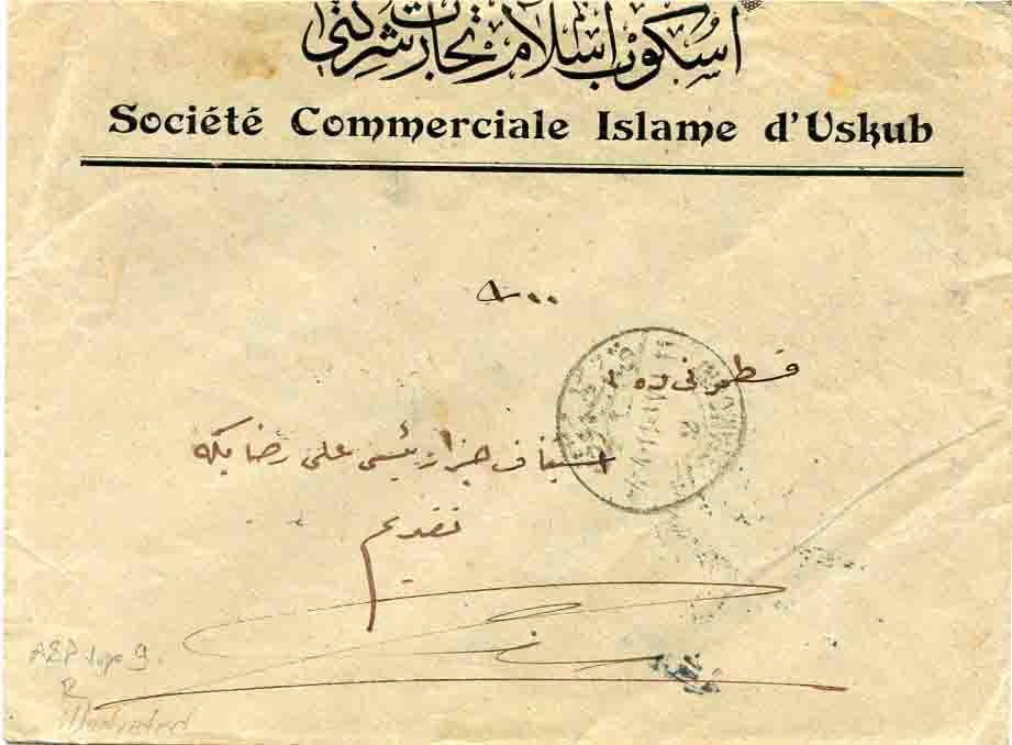 Ottoman Macedonia: 1911 (14 Jan). Bi-lingual headed cover Societe Commerciale Islame d’Uskub to Istanbul franked on reverse with 1pi and tied by USKUB (A&P type 9, R, illustrated) bi-lingual date stamp.