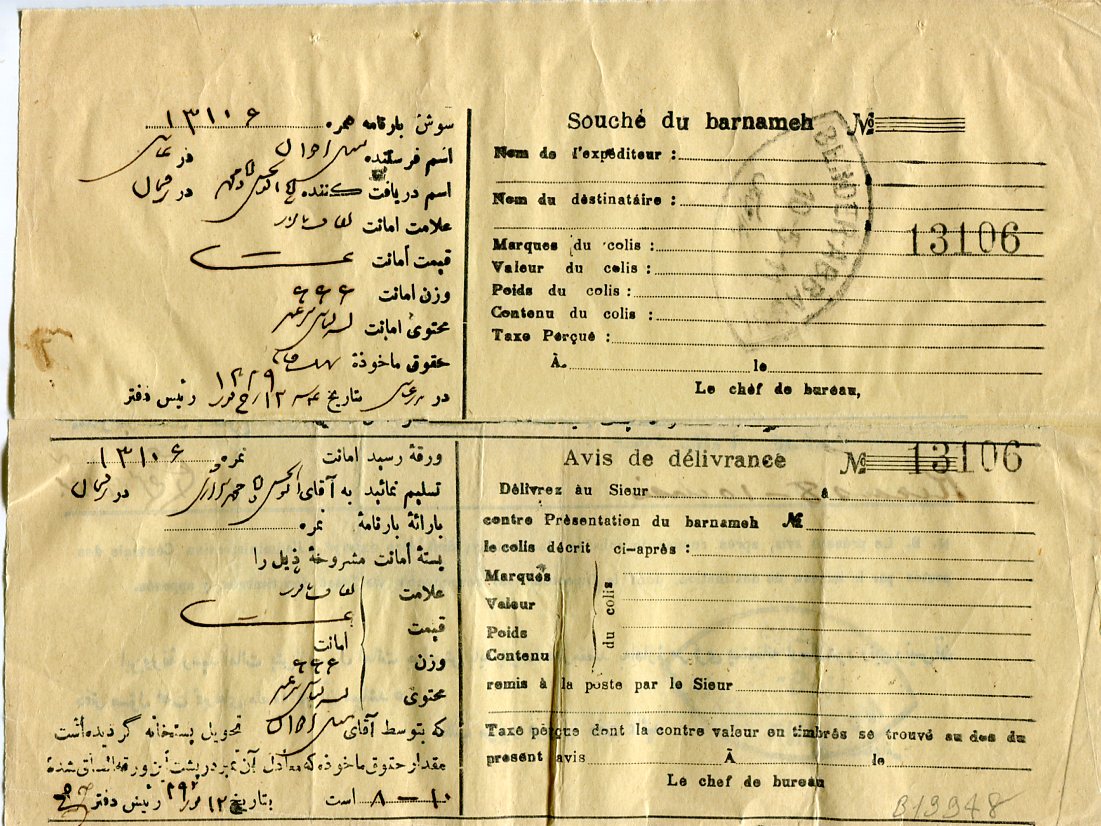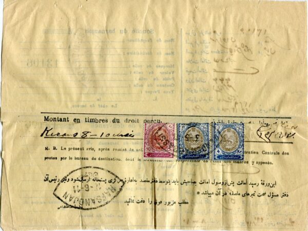 Iran: 1911 (3 May). Complete waybill franked with 10ch and two 4k coat of arms definitive stamps tied by Bander-Abbas oval datestamp and struck by Rafsandjan 15 June and on reverse 10 June Bander-Abbas datestamps.