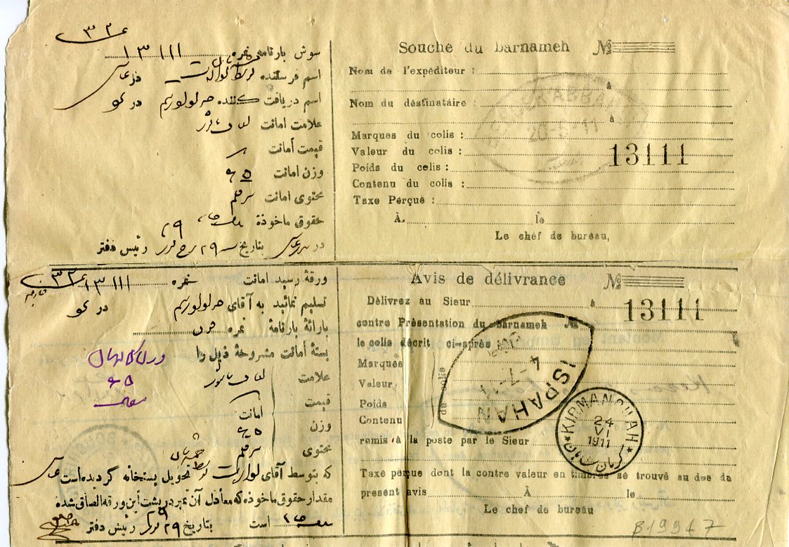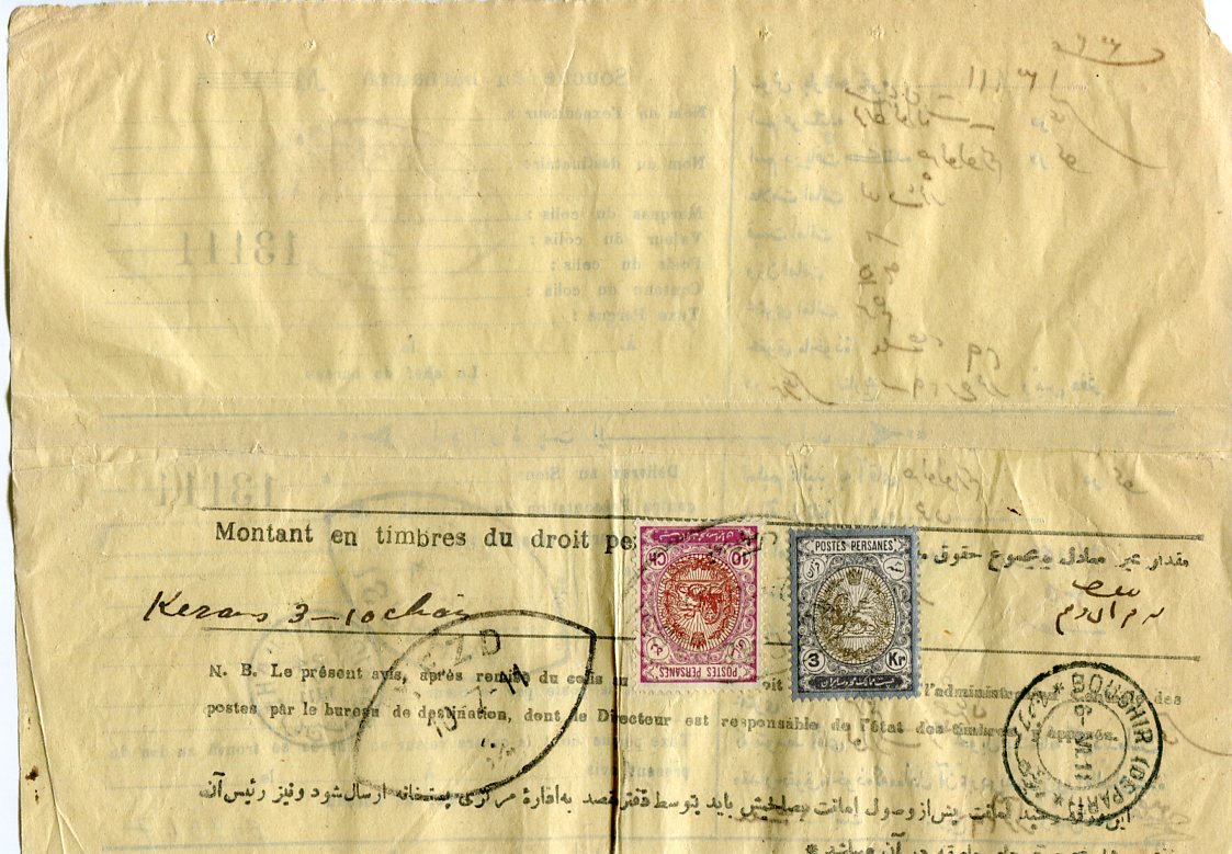 Iran: 1911 (24 June). Complete waybill struck on reverse with Kirmanshah and 4 July Ispahan datestamps, on front 6 July Boushir transit cds franked with 10ch and 3kr coat of arms definitive stamps tied by 10 July Yezd oval arrival ds.