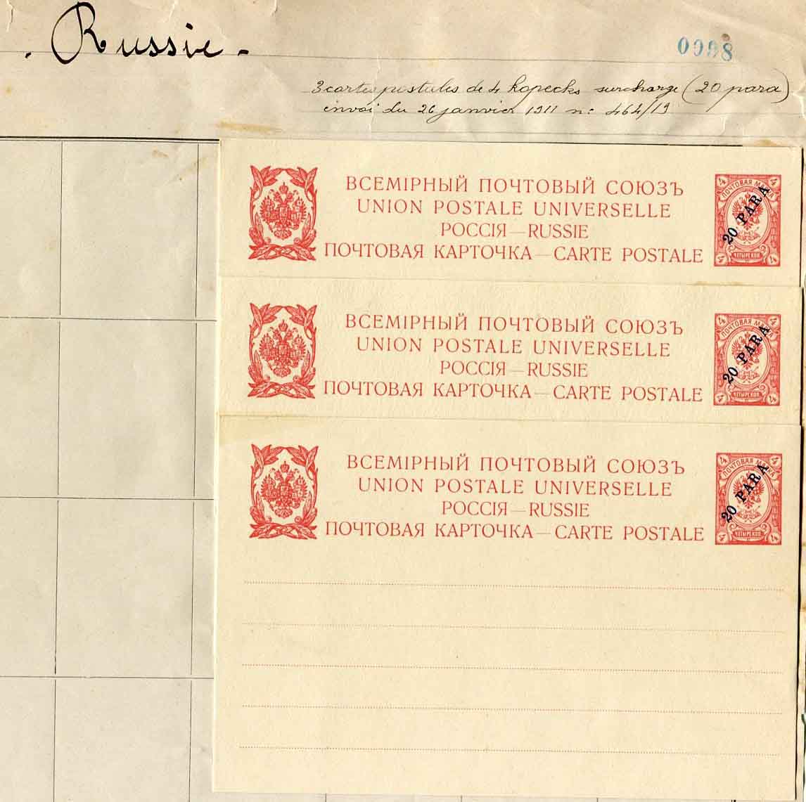 Russian Levant: 1911 three Russian 4k postal stationery card surcharged 20 PARA in blue for use at Levant partially stuck on Madagascar UPU Postal Archive folded page