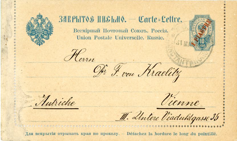 Russian Levant: 1911 10k lettercard surcharged 1pi. Turkish currency addressed to Vienna struck by ROPIT Konstantinopel datestamp.