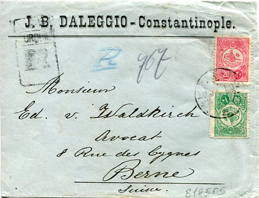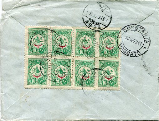 Ottoman Turkey: 1911 (29 August). J.B. Daleggio imprinted registered commercial cover to Switzerland franked with 10pa, 20pa and on reverse block of eight 10pa foreign use discount overprinted stamps of 1910 tied by Galata 5 datestamps, next day Constanta * Mandate, Romania transit and 3 September Bern arrival cds. Isfila 299, 300, 304