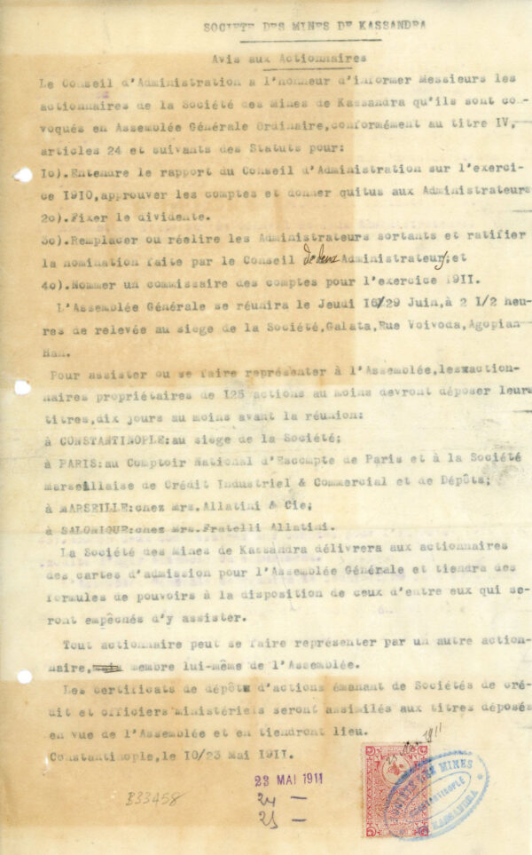 Türkiye: 1911 ‘Societe des Mines de Kassandra’ mine document with fiscal stamp.