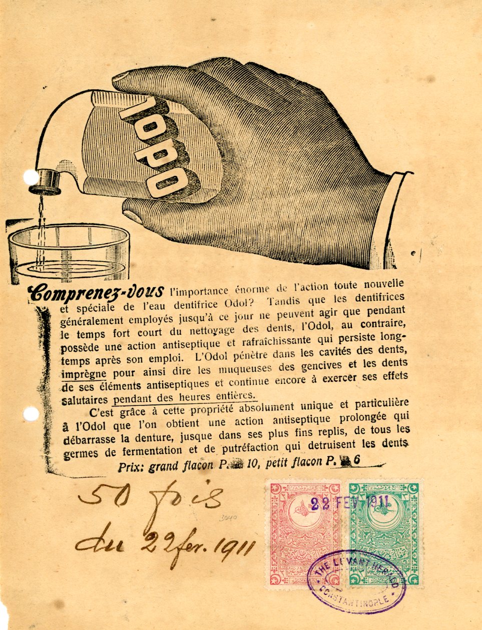 Türkiye: 1911 Water Purifier advertisement franked with 2pa and 3pa fiscal stamps tied by Levant Herald datestamp. Reverse blank. 167 x 220 mm.