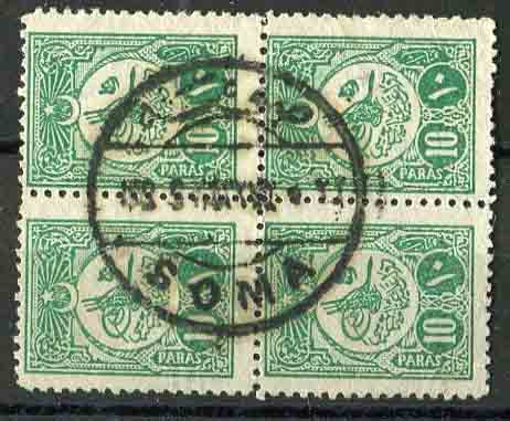 Ottoman Turkey: 1911 block of four 10pa of 1910 issue struck by superb SOMA (vilayet Aydin, A&P type 4, R) bi-lingual datestamp.
