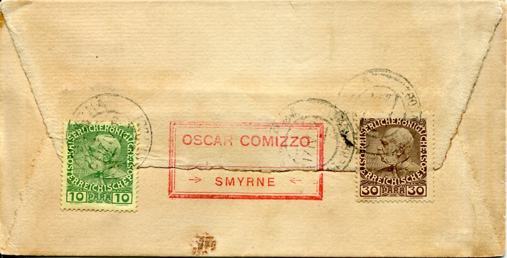 Austria Levant: 1912 (17 April). Cover to Austria franked on reverse with 10pa and 30pa Turkish Currency Austrian stamps tied by Smyrna datestamps and Oscar Comizzo – Smyrne merchant cachet.