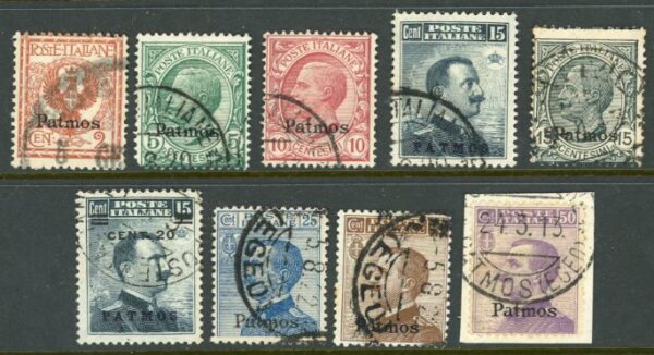 Greece – Dodecanese Islands – Italian Occupation: 1912 (1 December)-22. Stamps of Italy overprinted PATMOS used values to 50c. Sg. 3H/13H (between).