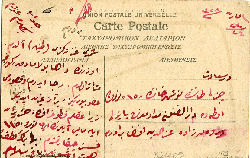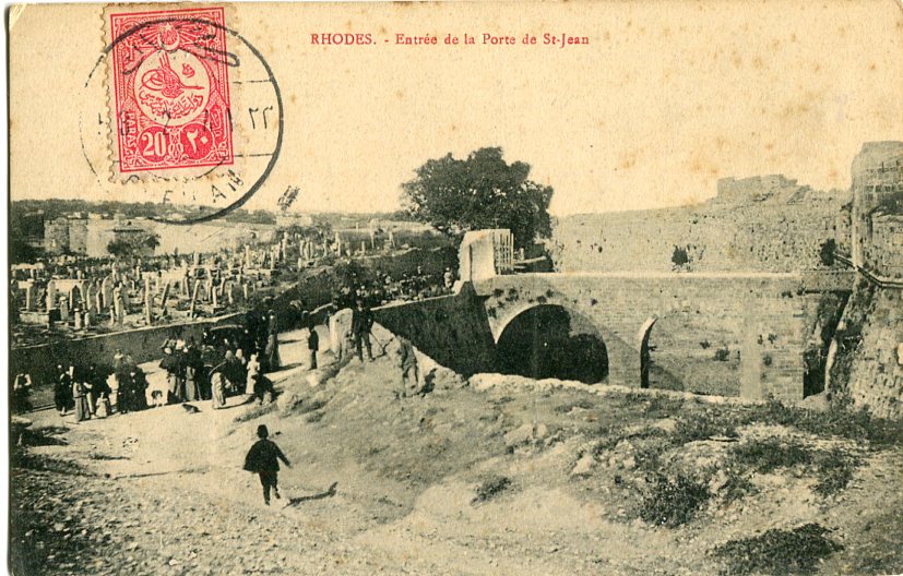 Ottoman Kosovo: 1912 (5 April). Postcard of Rhodes to Dersaadet (Istanbul) franked on front with 20pa of 1910 definitive for twenty paras postcard rate tied by GEYLAN – GUEILAN [today Gjilan] (vilayet Kosovo, A&P type 2, RR) datestamp.