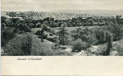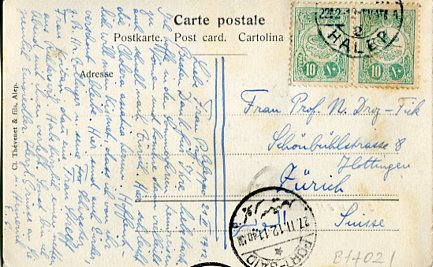 Ottoman Syria: 1912 (22 February). Picture postcard titled ‘Souvenir d’Houdekhi’ (ed. Thevenet) to Zurich, Switzerland franked with pair of 10pa of 1909 Tughra issue and tied by HALEB – HALEP 2 (A&P type 20) datestamp and 27 February Port-Said transit cds.