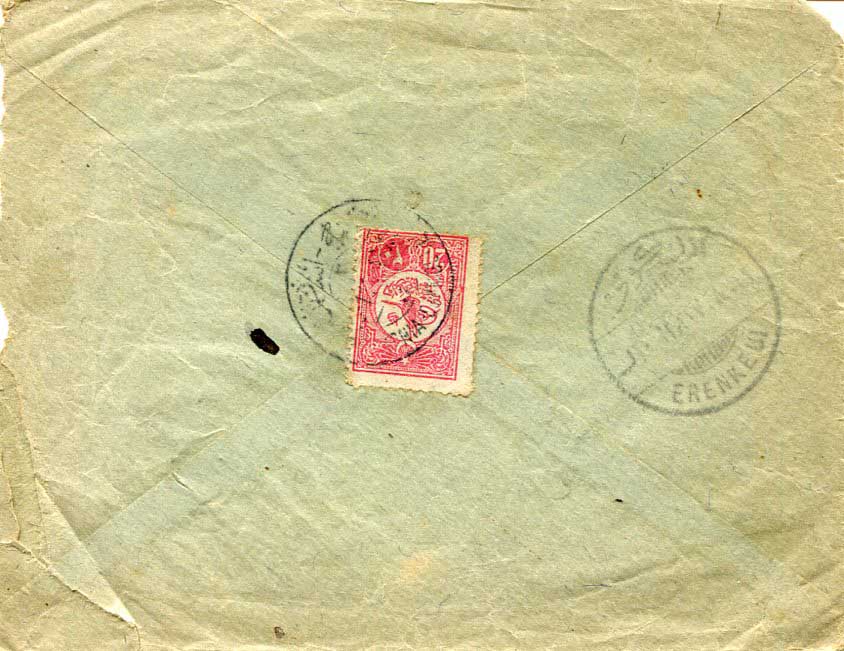 Ottoman Turkey: 1912 (September). Cover to Istanbul franked on reverse with 20pa of 1909 stamp and tied by KONYA-ISTANBUL – KONIA-STAMBOUL 3 (A&P type 502, RR) TPO railway datestamp and 25 September Erenköy arrival cds.