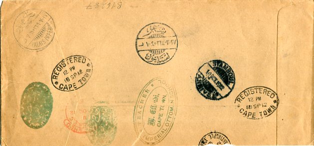 South Africa – Ottoman Empire: 1912 (18 September). Registered official cover from an Imperial Ottoman School at Cape Town addressed to Sultan Mohammed V (Reshad) struck by oval dispatch, red October hooded London transit, part British Post Office Constantinople and 10 October Stamboul & SARAY-I HUMAYUN – PALAIS IMPERIAL (A&P type 3) arrival cds’s. Very rare and possibly unique.